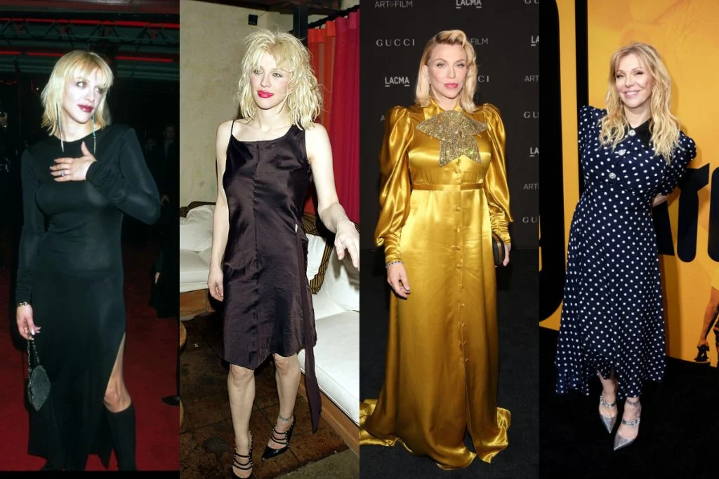 90s Courtney was as punk and messy as it gets. You couldn’t tell if she woke up like that with smeared black eyeliner and messy hair or if it was styled that way. But that was her signature look in those days: black from head to toe, a choker and some fishnets and lots of eyeliner with a red lip. These days Courtney has fully reinvented her style and chose to go Hollywood glam instead.