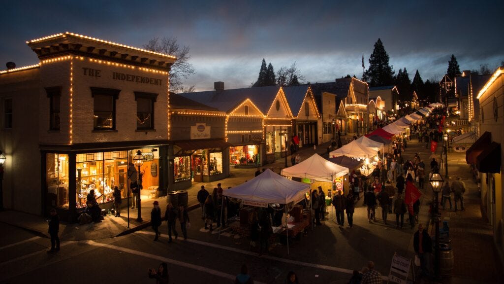 Mendocino County’s old-growth redwood forest, lush tangle of ferns, and velvety moss are on full display for passengers who ride the Skunk Train any time of year. But when you book the magical Mr. Skunk & the Giant Christmas Tree train ride, departing from Willits Depot, you and your kids can see all that natural beauty decked out in colorful Christmas lights and other whimsical decorations.
