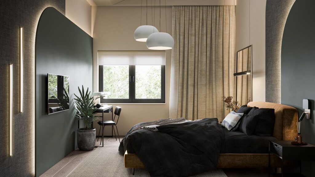 “Ambient lighting, supplied by ceiling-mounted fixtures or strategically positioned recessed lights, establishes the general illumination stage within the room. Job lighting, comparable to bedside lamps or pendant lights positioned above particular areas like a studying nook, presents focused brightness.”