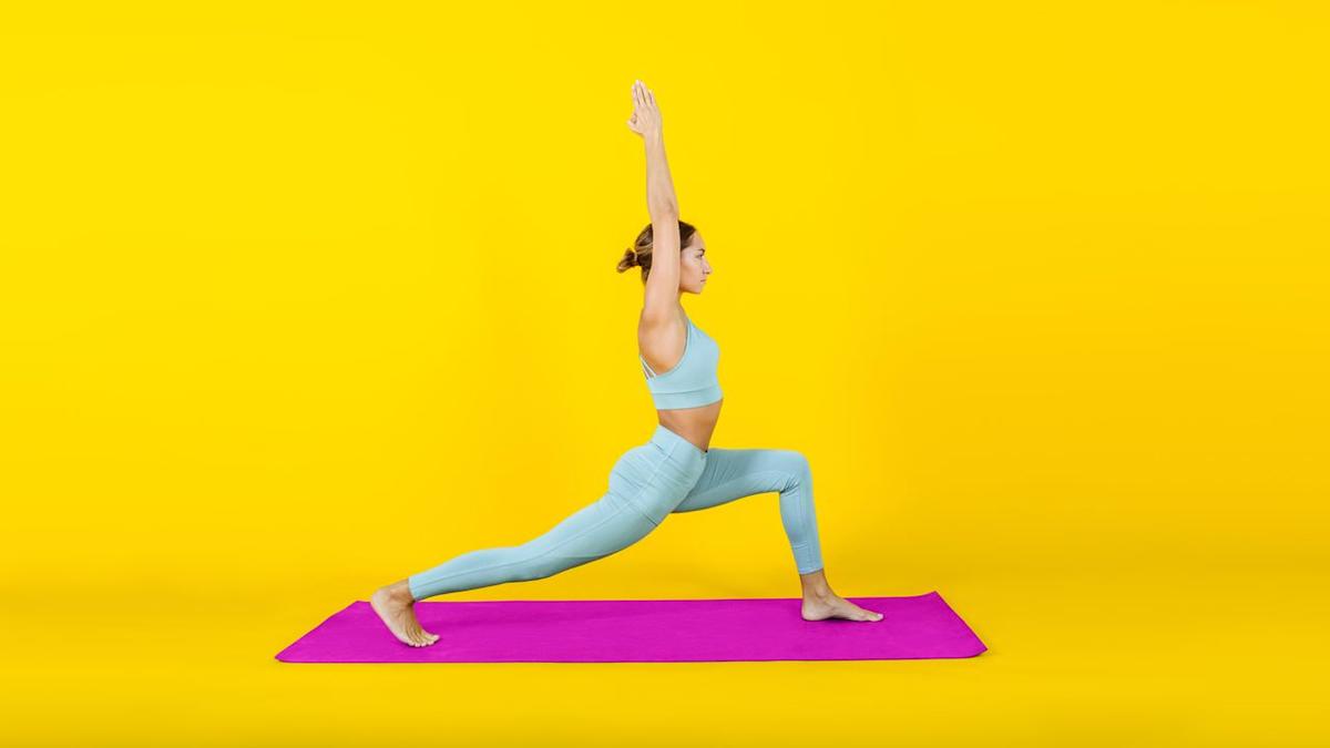 Woman holding a lunge while on a pink exercise mat in a bright yellow room.