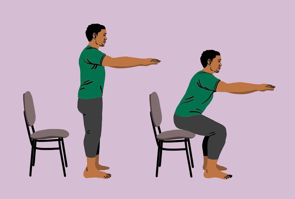 Advanced Exercise: Perform slowly from a lower chair or while holding light weights, or progress to traditional squats without a chair.