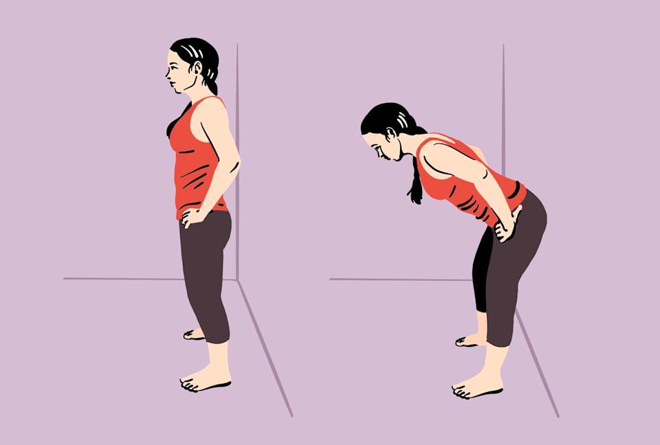 Hinge at your hips, gently pushing them back while keeping your back straight. Your glutes may lightly touch the wall to guide you.