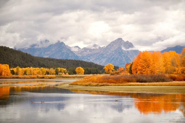 Grand Teton, by contrast, was consistently photogenic. We rarely found a view that didn’t feel camera‑ready. Even under clouds, Grand Teton’s mountains and lakes carried undeniable beauty. On bright days, the golden foliage glowed against the peaks, and the lakes mirrored jagged summits and drifting clouds with painterly precision. Pink peaks at sunrise were unforgettable, both to the eye and through the lens.