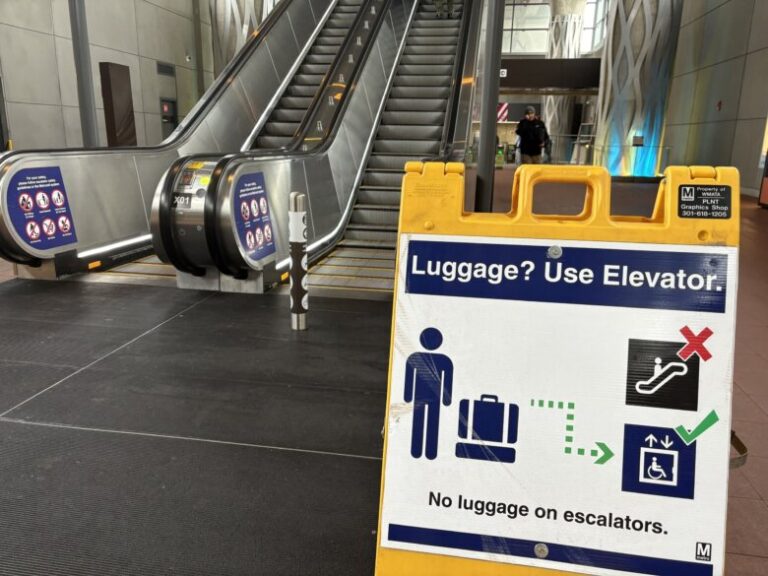Metro has installed a 3-foot-tall bollard and safety signs in front of a bank of escalators heading out of the station. The signs say “no luggage on elevators,” and the bollard features pictures of a baby stroller, scooter and bicycle and the words “elevator use only.”