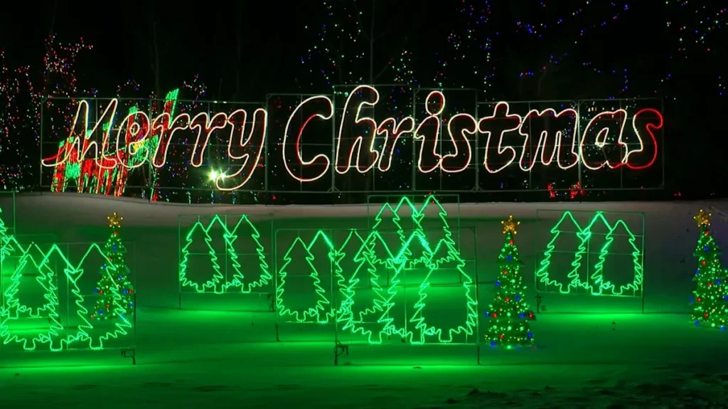 A display at Bentleyville with elves, Christmas quotes, and decorations in a giant TV – @walkingminnesota / YouTube