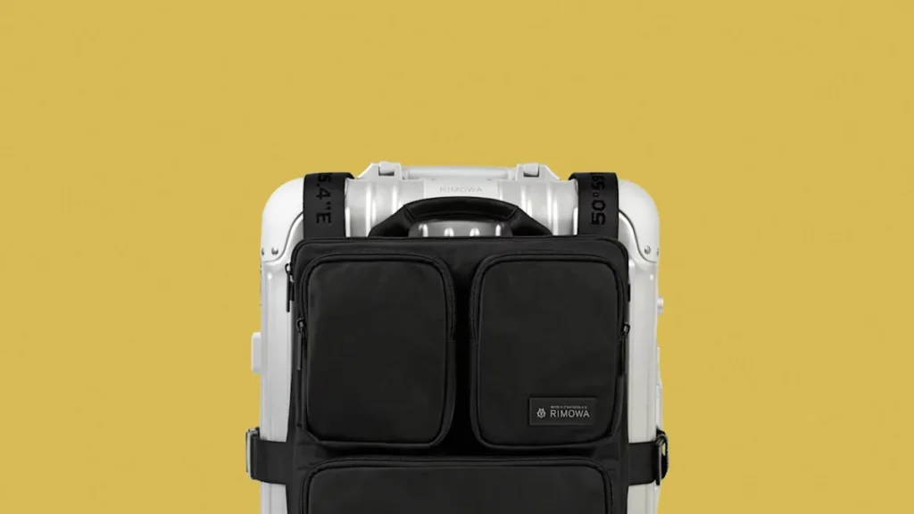 The Cabin Luggage Harness Backpack is perfectly designed to ride on top of Rimowa’s Original, Classic, Essential, Essential Lite, and Hybrid cabin collections, attaching via adjustable straps that secure to the telescoping handle – Credit: Rimowa