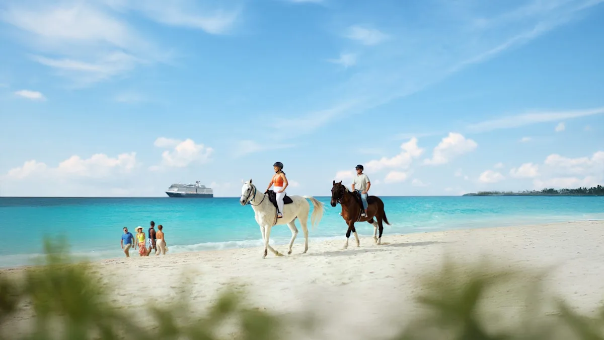 holland america cruise ship in the caribbean with a beach and horseback riders in the foreground