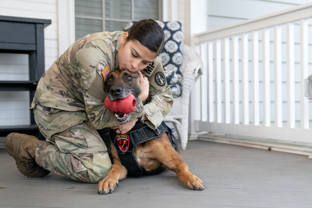 Army Spc. Michelle Juares has been reunited with her now-retired K-9 partner, Darco.
