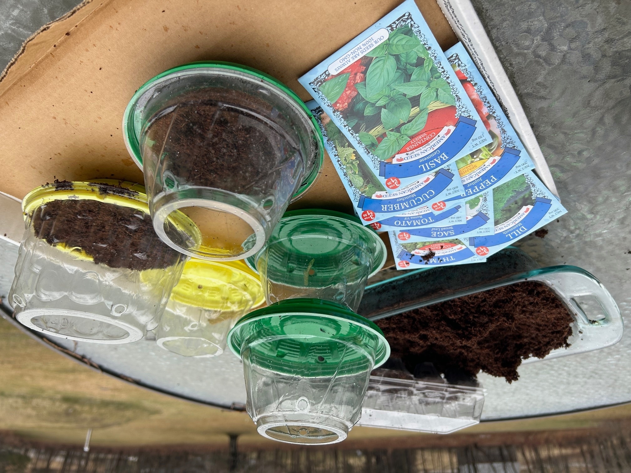 Plastic yogurt containers with holes poked in their bottoms make wonderful seed-starting pots. So do plastic clamshell lettuce and berry containers.