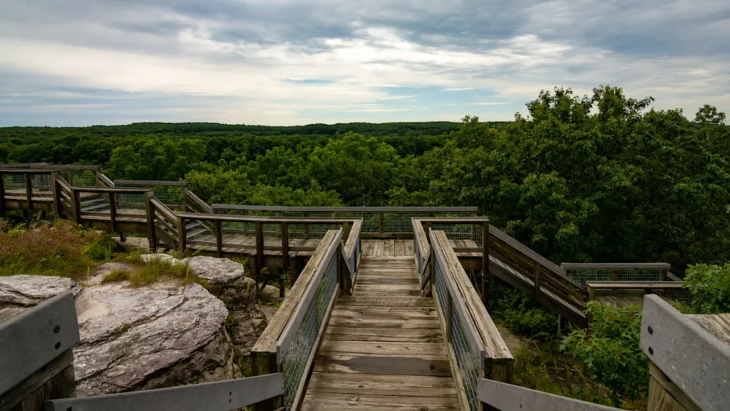 Taking a road trip through Illinois can be quite the adventure, especially if you visit historic attractions on Route 66 or some of the state’s scenic overlooks with otherworldly rock formations. Along the banks of Rock River, near the sleepy town of Oregon, you’ll find a lovely park perfect for quiet nature walks and soaking in the beauty of the surrounding landscape. Castle Rock State Park is a wilderness wonderland, featuring 2,000 acres of pristine forest and prairie land. The park is nestled along State Route 2, located roughly 100 miles from Chicago and 140 miles from Cedar Rapids.