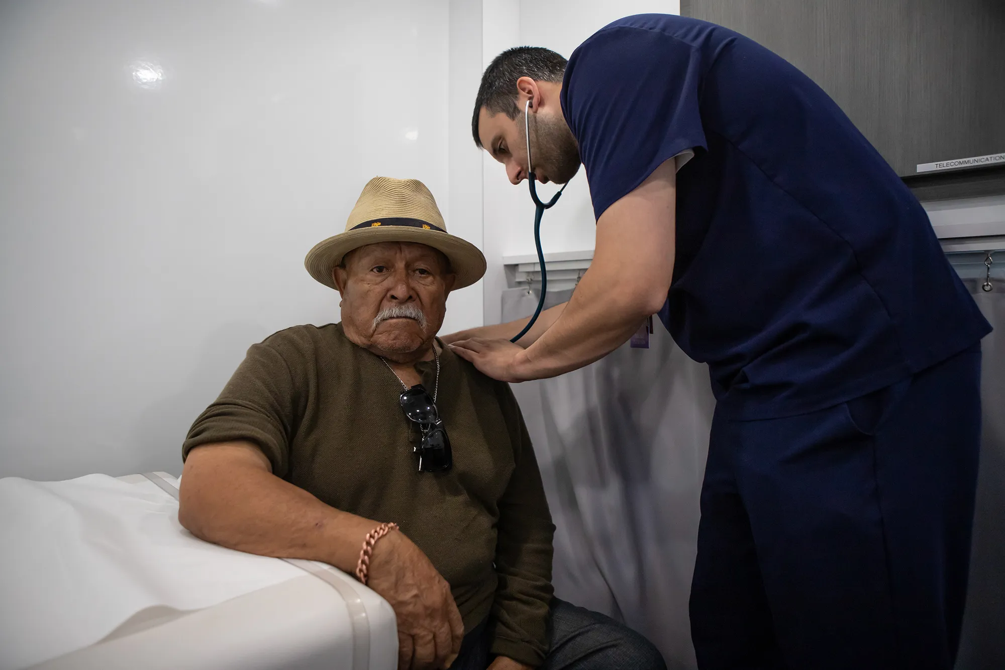 Parlier resident Javier Hernandez gets a checkup at the Saint Agnes Mobile Health Unit mobile clinic parked at the City Heritage Park in Parlier on May 16, 2025. Photo by Larry Valenzuela, CalMatters/CatchLight Local