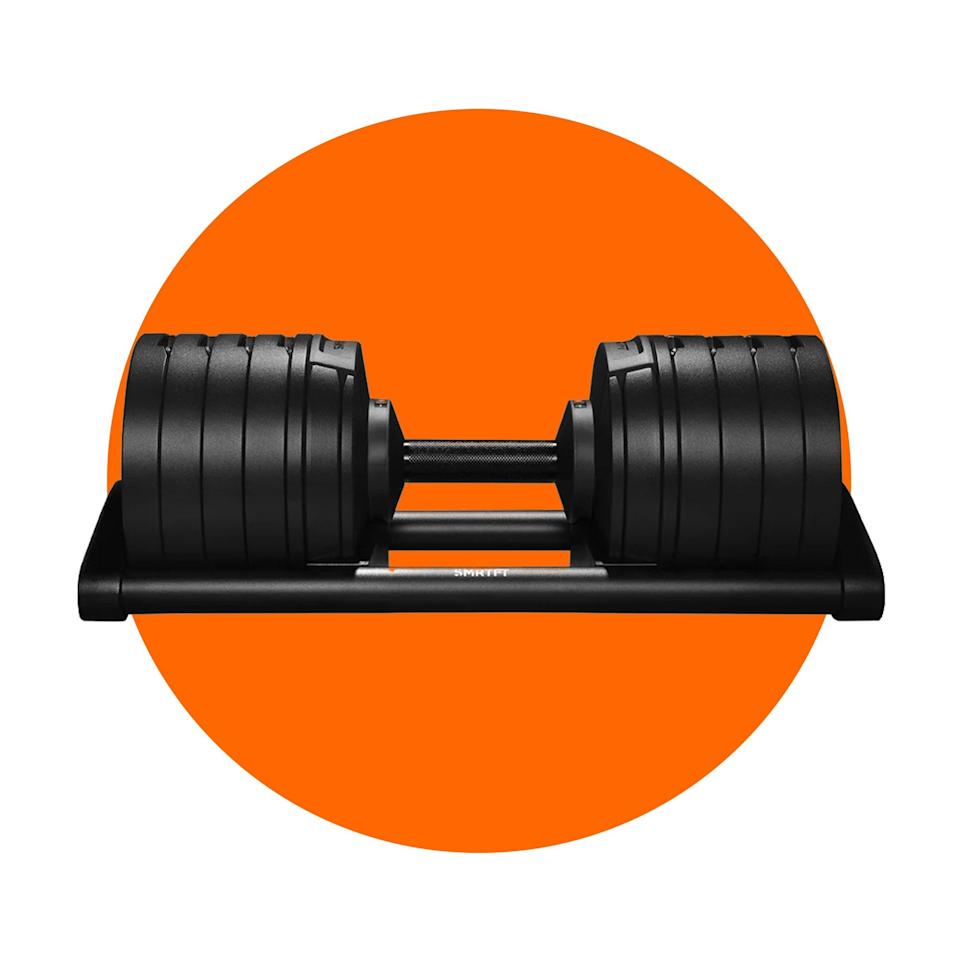 Adjustable dumbbells typically cap out at around 50 to 80 pounds, which may not cut it if you’re lifting heavier. Yes, this pick is an investment, but getting up to 200 pounds of weight in one sleek, compact set is worth every penny if you’re serious about training at home, says executive health and fitness director Jacqueline Andriakos, CPT.