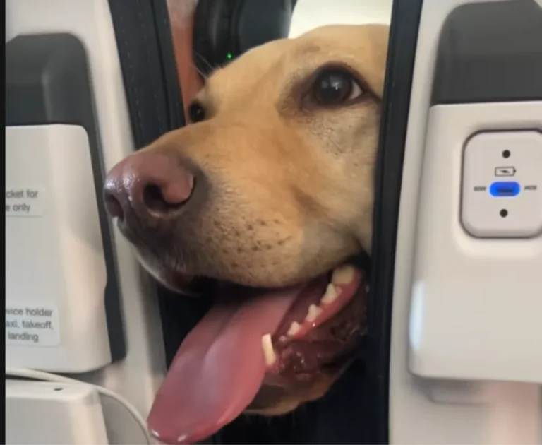 In the short clip, a pink nose, yellow floppy ears, and two big brown eyes push their way through the gap between seats. The dog’s paw is visible as it silently peers at Sophie to make sure she’s okay before breaking into a big, tongue-wagging doggie grin.