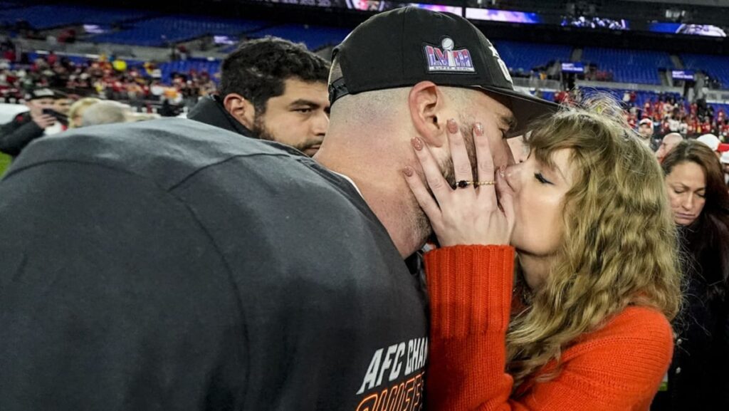 Taylor Swift greets Tremendous Bowl-bound Travis Kelce with a kiss after Kansas Metropolis Chiefs win the AFC title sport