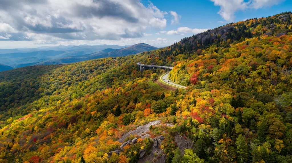 A car zooms along the Blue Ridge Parkway in autumn – Bilanol/Shutterstock