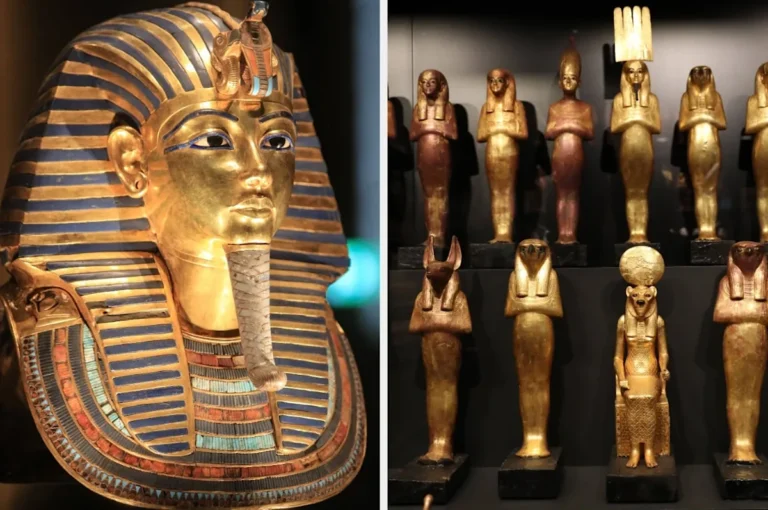 Ancient Egyptian statues displayed in a museum exhibit, each with distinct headdresses and poses, showcasing the artistry of the period