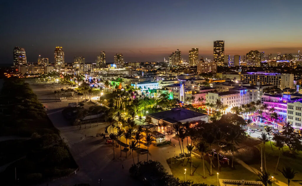 Colorful Art Deco hotels on Ocean Drive in Miami Beach glow under the warm hues of a vibrant sunset, capturing the lively charm of South Beach