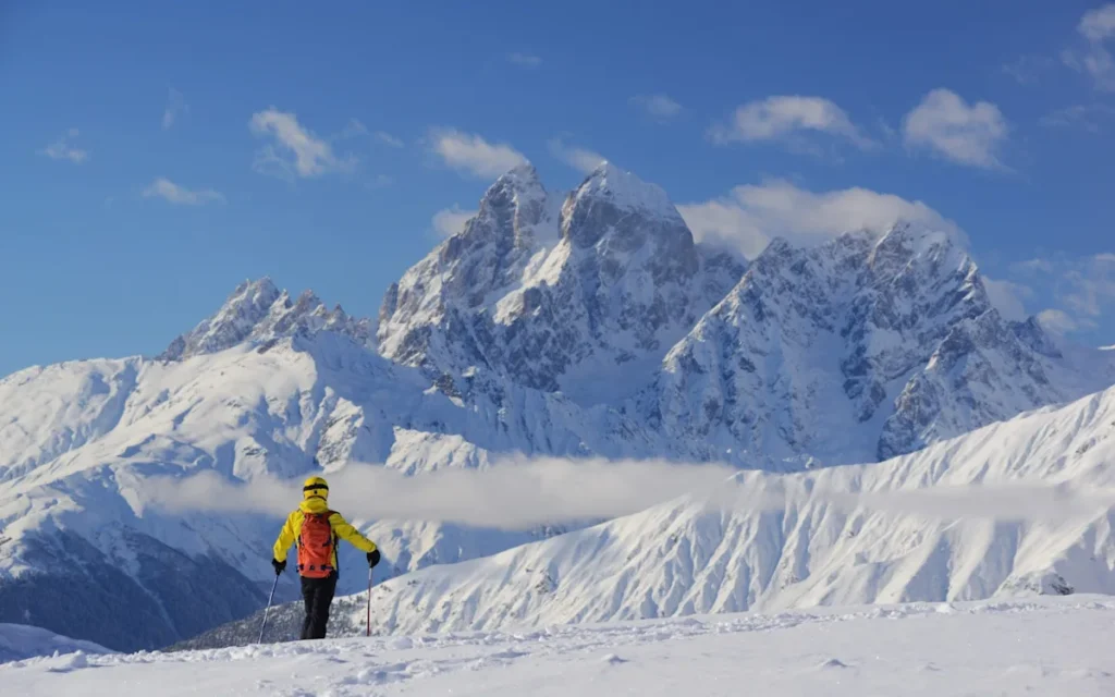 The mountain town of Mestia, known for its stunning natural scenery and medieval Svan towers, is the base for skiing Tetnuldi – E+