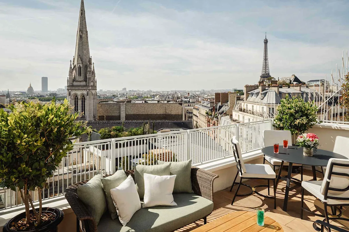 Select suites boast 180-degree views across the Paris skyline, with the Eiffel Tower framed like a living postcard. Post-renovation, half of the suites and guest rooms open onto private terraces, a rarity in central Paris. I stepped out on my patio several times during the day and night just to get a glimpse of the city’s skyline.