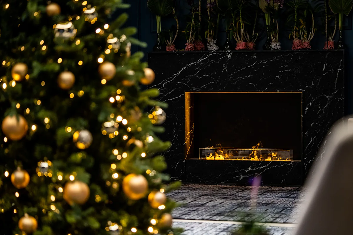 The lobby is the centerpiece, with a towering Christmas tree, decorated head to toe in bulbs and lights, with a glowing fireplace in the background. Smaller trees with gold and silver bulbs with wrapped presents pepper the hotel, while the imprint of snowflakes decorates the windows. Red berries and Christmas flowers sit on open tables, permeating that beloved holiday scent throughout the hotel.