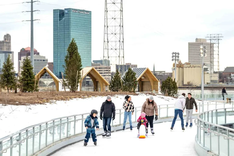After an over $200 million investment, the city transformed the former industrial zone along the Maumee River into a year-round recreation hub in 2024. Come winter, visitors get to enjoy one of the park’s coolest features, The Ribbon: a 1,000-foot-long ice skating trail that winds along the river and connects to a 5,000-square-foot skating pond.