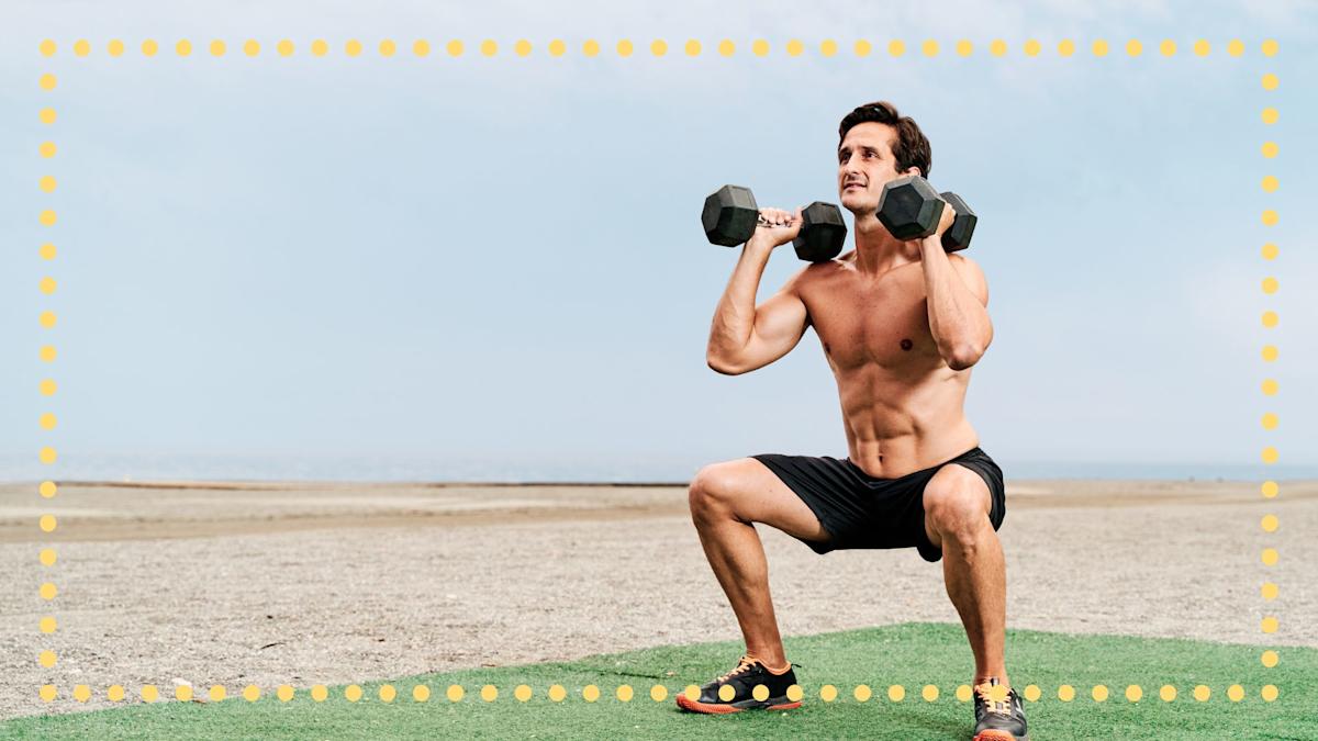 The squat-to-press is both a strength and cardio move. “The lower body — glutes, quadriceps, hamstrings and calves — does the heavy lifting, powering you out of the squat and driving the movement upward,” says Simms. Heavier weights with lower reps build strength, while lighter weights with higher reps or timed sets push conditioning. Adjust your load and rep scheme based on your goal for that session.